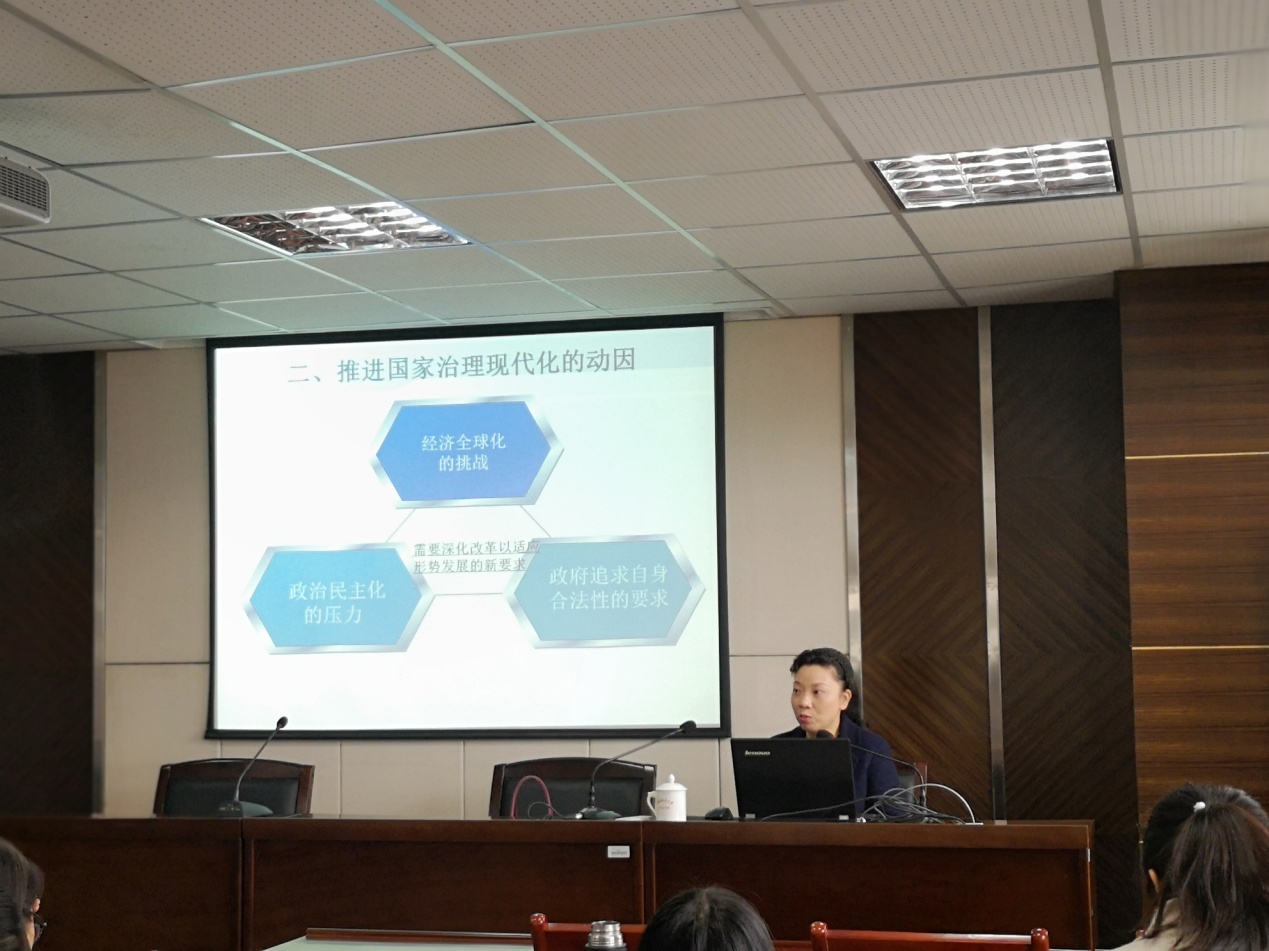 讲座伊始,傅慧芳教授介绍《习近平谈治国理政》一书,从该书出发为大家阐释中国道路、中国价值和中国方案。紧接着,傅慧芳教授以党的十八届三中全会提出的“完善和发展中国特色社会主义制度,推进国家治理体系和治理能力现代化”为主题,充分结合学科专业特色,以马克思主义为视角,从推进国家治理现代化的动因、国外行政改革对我国的影响和启示、国家治理的困境和推进国家治理现代化的科学内涵四个方面进行科学阐释。傅慧芳教授运用多种案例阐释国外行政改革对我国的影响和启示,强调我们要学习借鉴国外政府治理和社会治理的经验,以此解决我国国家治理中的困境。最后,傅慧芳教授通过对“治理”、“中国实际”和“治理体系和治理能力”三个方面的深入讲解,帮助大家完整把握推进国家治理现代化的科学内涵。至此,本次讲座落下帷幕。