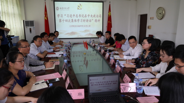 4月24日下午,校党委副书记潘玉腾参加文学院2016级研究生党支部学习“习近平总书记在中央政治局第十四次集体学习时的重要讲话”学习会,组织部、宣传部、文学院党委有关负责同志列席参加。