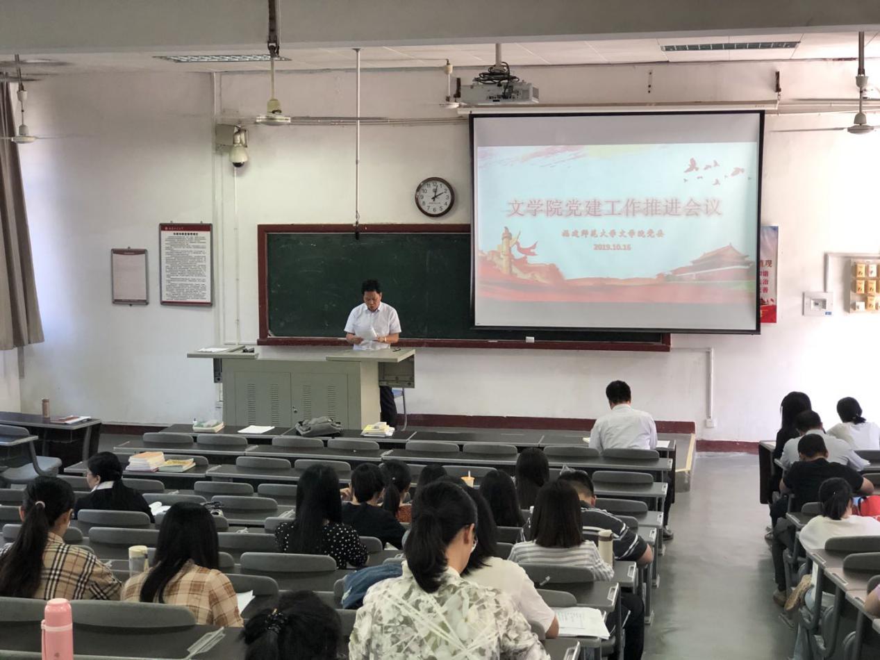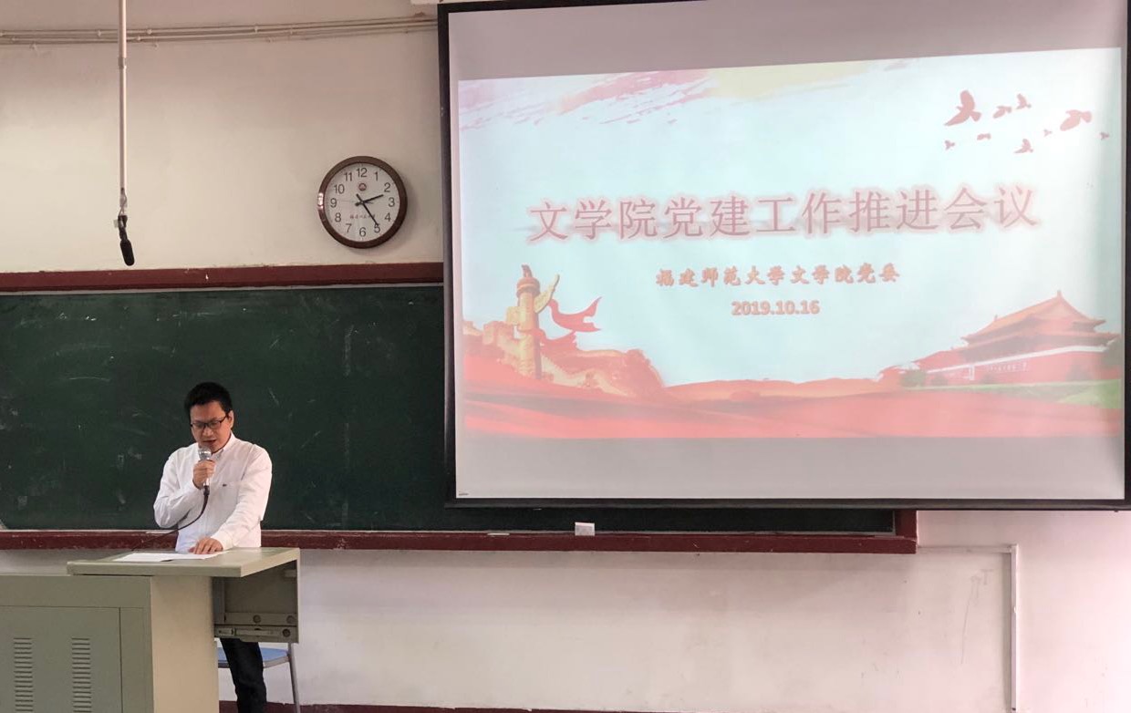 10月16日下午,文学院在仓山校区文科楼104教室召开“学院党建工作推进会议”,院党委书记李建华、院党委副书记李彬源、组织员郭静虹和学院全体党支部书记参加会议。大会由院党委书记李建华主持。