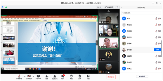 学院邀请了福建省第四批援鄂医疗队成员,福建医科大学附属协和医院肾内科叶秋萍医师分享援鄂经历。一系列数据、一张张图片、一幕幕场景,叶医师声情并茂地介绍了医疗3组的组员以及在武汉的救治经验和点滴故事。在疫情最严峻的时候,这些最美的逆行者们挺身而出,不惧困难,冲锋陷阵,以精湛的医术以及团结协作的精神,圆满完成任务,实现了“零感染、打胜仗”的目标。同时,医师们不忘自己肩负的立德树人使命,在前线繁忙的工作中仍然坚持网络教学,严谨的治学态度和无私奉献的崇高精神让在场的所有党员深受触动。